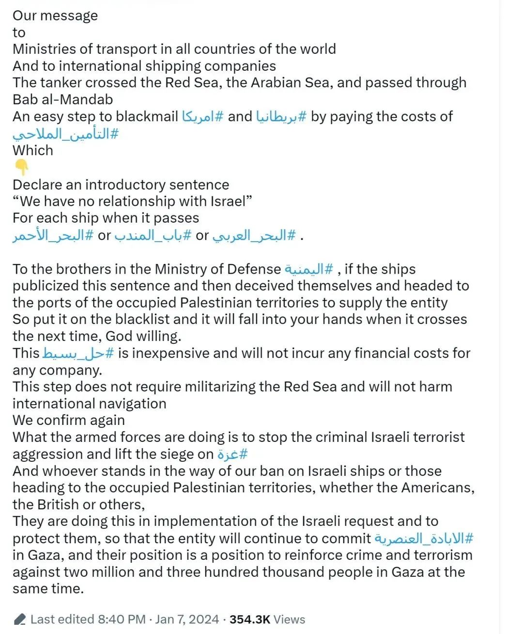 1月7日,胡塞发表声明称,只要通过红海的船舶声明“与以色列没有关系”,就不会遭到袭击。