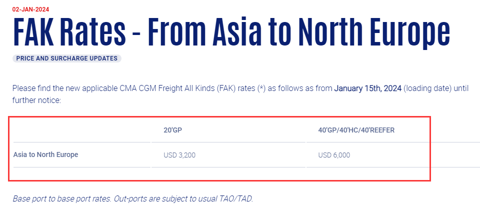 值得注意的是,红海周遭情势持续升温,全球航商已让超过2000亿美元的贸易额绕道而行,推升航运成本并使交货延误加剧,亚洲至北欧的运费本周已上涨超过一倍。达飞也宣布自1月15日起再次上调亚洲出口至北欧和地中海地区的FAK费率。